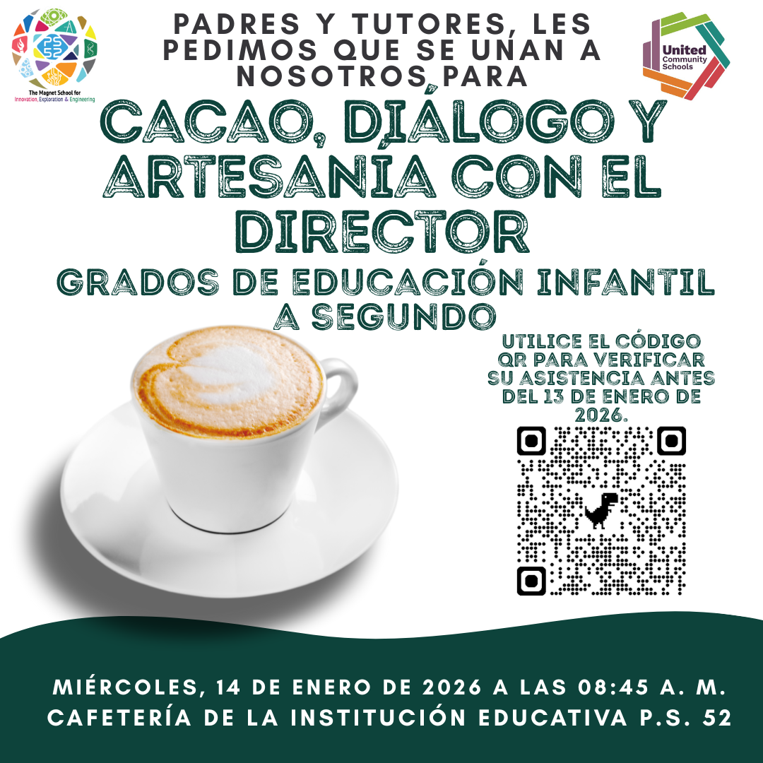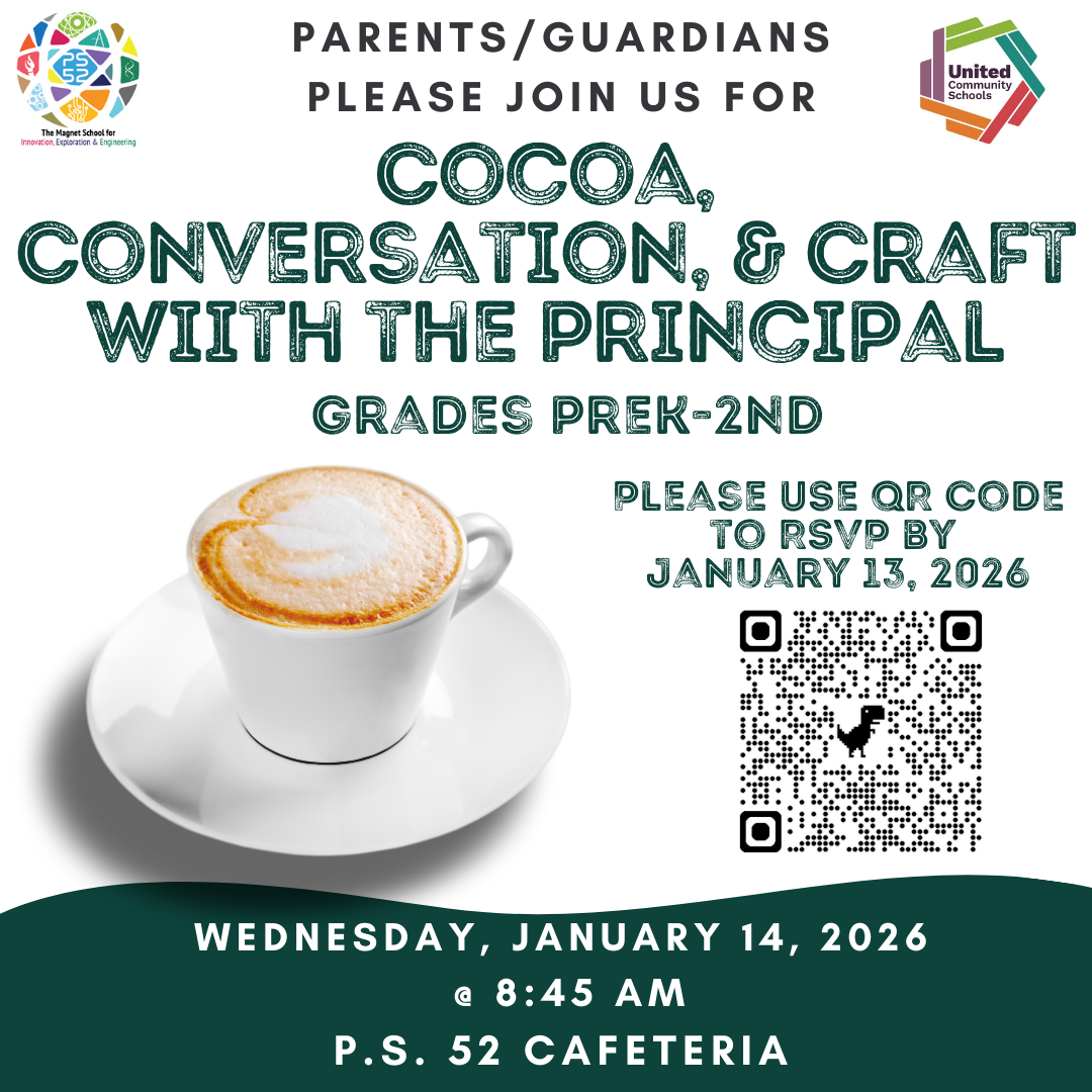 Pre-K to 2nd Grade Cocoa, Conversation and Craft with the Principal, Ms. Fleurant.
