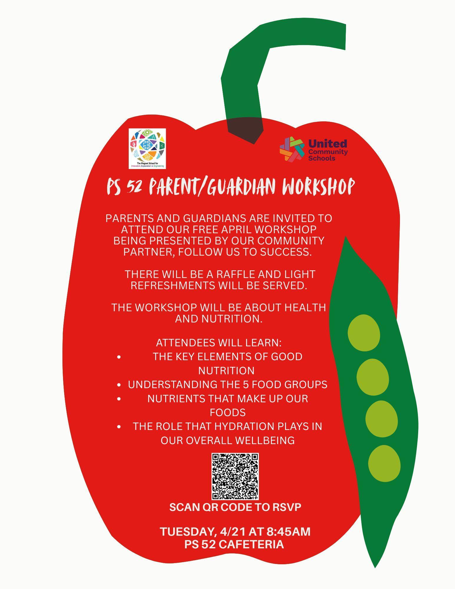 You are invited to a free workshop on Tuesday, April 21st at 8:45am being held in our school's cafeteria. Staff from our community partner, Follow Us to Success, will be talking to families about food and nutrition and the impact they have on our overall health and how we feel day to day.